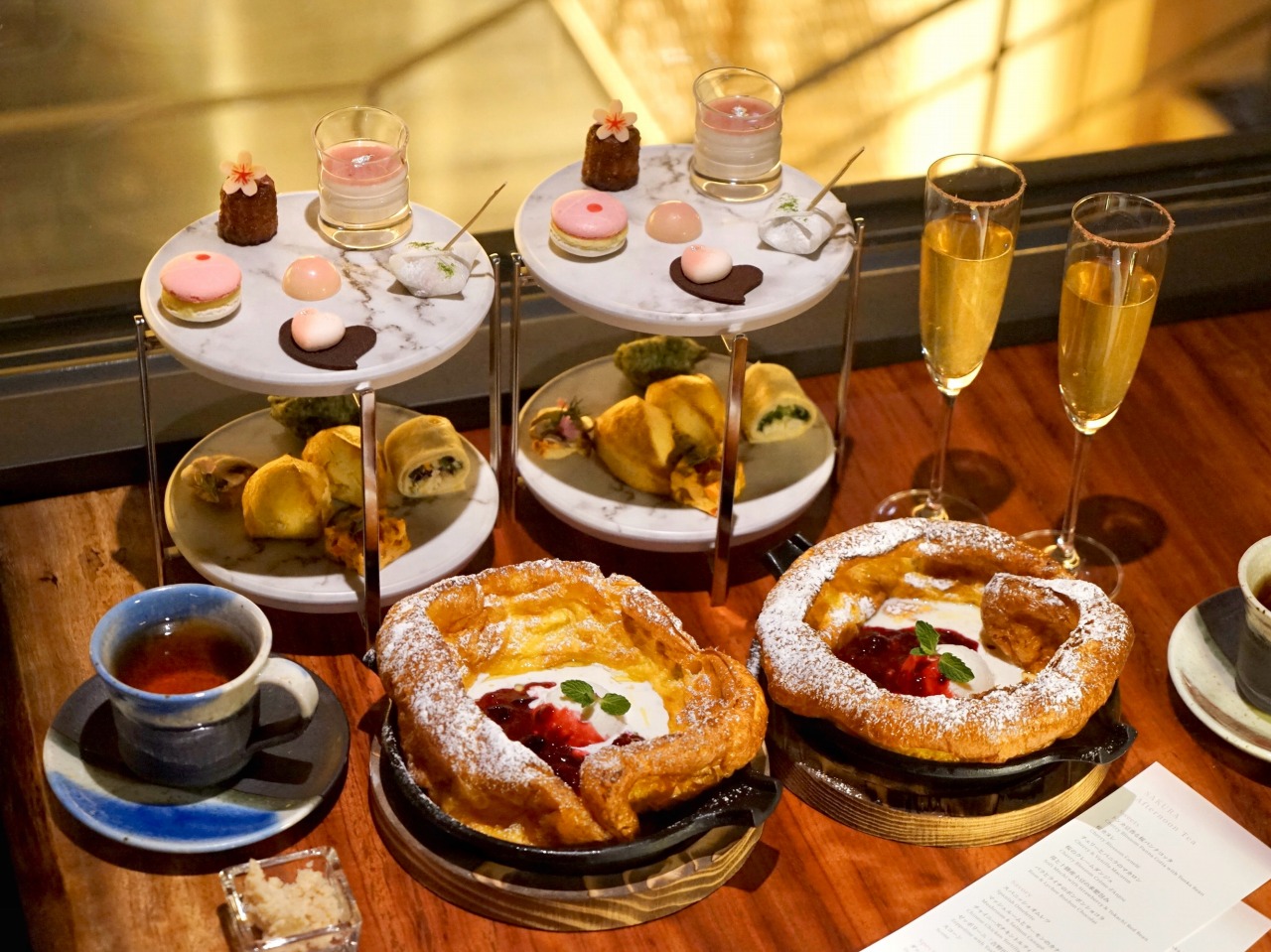 高級感のある2段スタンドの上段に美しく並ぶ春色のスイーツ。スタンドとは別に提供される、焼きたてのダッチベイビーなど、充実したラインナップが魅力です。今回は特に印象に残ったスイーツをピックアップしてご紹介します。